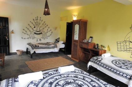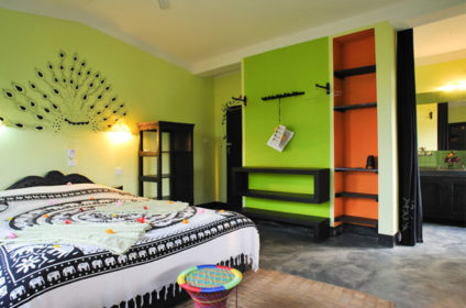 Sapana Village Lodge is located in a fantastic location bordering beautiful Chitwan National Park area in the southern part of Nepal. With an approximately 4 hours drive by road or a 15 minutes flight from Kathmandu, Sapana Village is definitely a suitable destination for individuals, couples and families. A uniquely designed hotel with an authentic Tharu decoration, Sapana Village aims to support the local community. Started as a small business hotel, it has developed as the sustainable and responsible Eco tourism project contributing to the indigenous people of the Terai region. Sapana Village Lodge has a small petting zoo for the children. We have rabbits, goats, peacocks , chickens and two elephants named Champakali and Chanchalkali. Our beautiful botanical and medicinal herbs and plants have become the residence for more than a hundred regular and migrant birds of the lowlands of Nepal. You will receive an amazing wake up call by these beautiful colored birds! At the lodge, you can book a great variety of excursions. Sapana Village Lodge has 28 beautifully decorated deluxe rooms. All rooms have a private bathroom with toilet, 24 hour hot water, and a balcony or veranda.